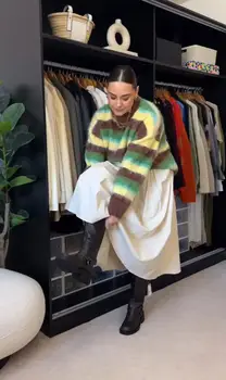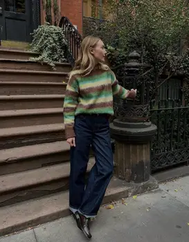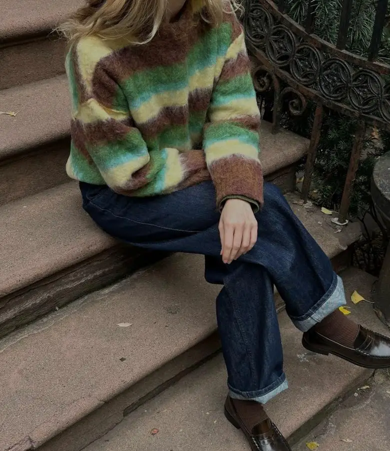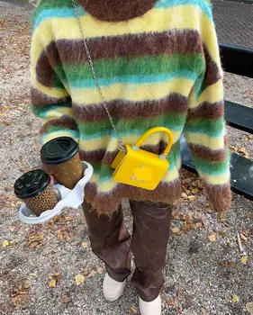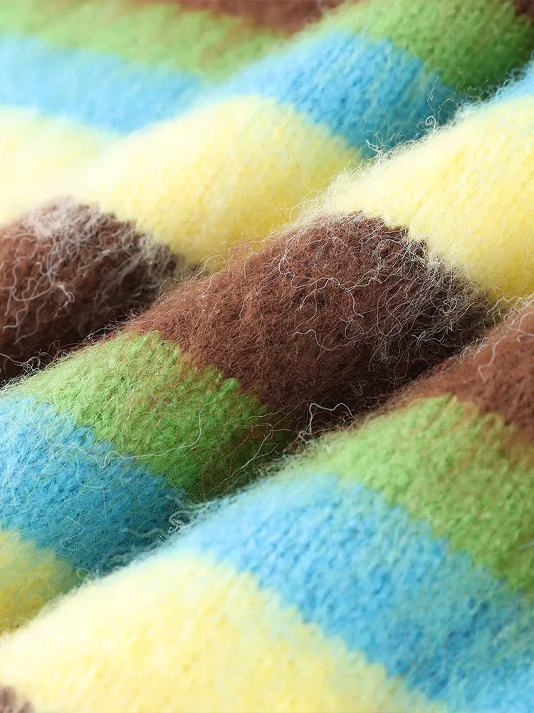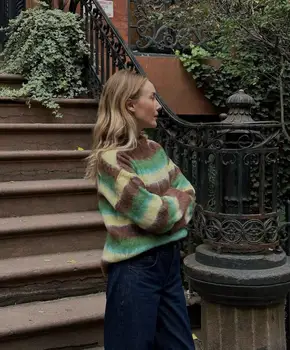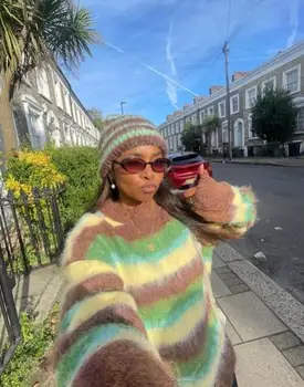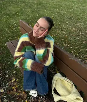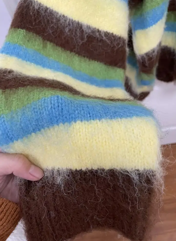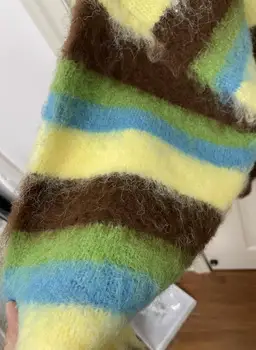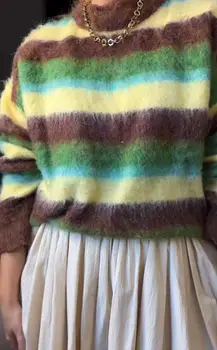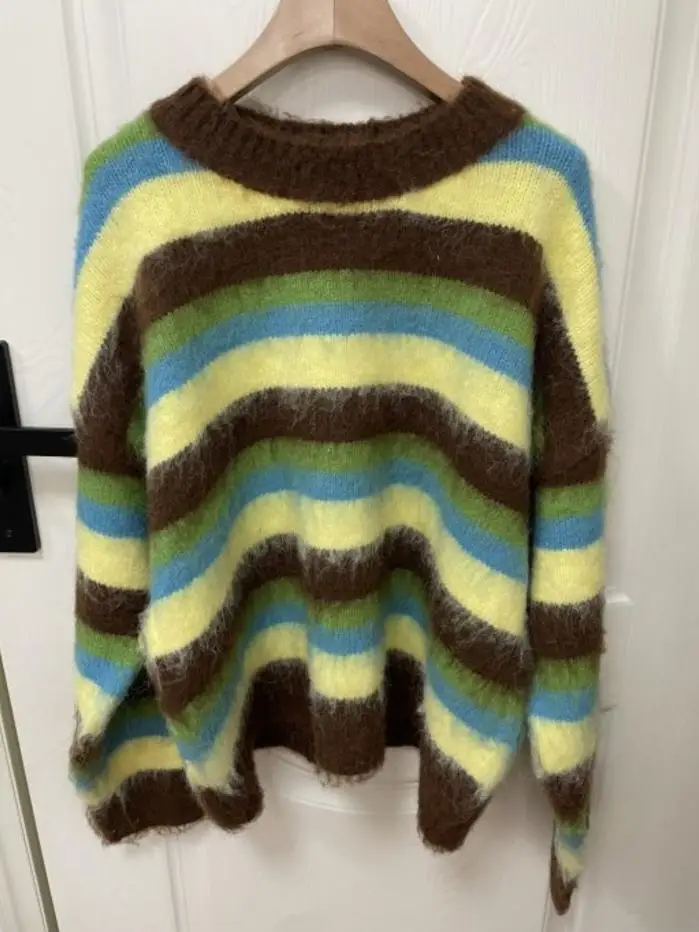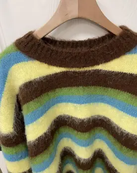 Mohair Striped Elegant Sweater Women Oversize Long Sleeve Contrast Color O-neck Pullover Female Jumper 2024 Autumn Colorful Tops